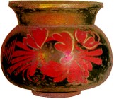 На одной из братин крупными темпераментными мазками написан красный цветок, свободно раскинувший лепестки и листья. Художник смело перекинул с черного фона на золотой мелкие лепестки, и золото засверкало еще ярче от упавших на него огненных мазков киновари. Белильные оживки, искусно брошенные на самые крупные лепестки, еще более выделяют его на черном фоне. В этом орнаменте восхищает не только виртуозное мастерство росписи, но и поэтичность созданного образа, заставляющего вспомнить сказочный, приносящий счастье красный цветок, который, как рассказывают предания, можно увидеть только в ночь накануне Ивана Купалы.