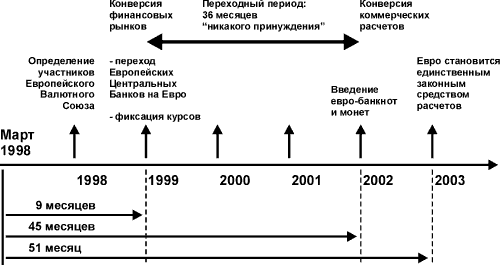 Таким образом, наравне с Евро, национальные валюты продолжат существовать в каждой из стран Евроклуба и после 1 января 1999 года, давая возможность выполнять платежи в национальных валютах в течение переходного периода. Принцип "нет принуждения, нет запрещения" позволяет корпорациям и институтам перейти к Евро, в их собственном ритме, и выбрать дату введения Евро в отрезке времени между 1 января 1999 года и 31 декабря 2001 года.