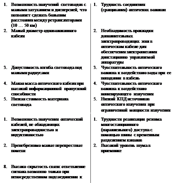 Таблица №1 Достоинства и недостатки оптоволоконной связи