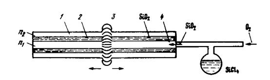Во внутрь полой кварцевой трубки с показателем преломления длиной 0,5..2 м и диаметром 16..18 мм подается струя хлорированного кварца и кислорода . В результате химической реакции при высокой температуре (1500..1700В° С) на внутренней поверхности трубки слоями осаждается чистый кварц . Таким образом, заполняется вся внутренняя полость трубки, кроме самого центра. Чтобы ликвидировать этот воздушный канал, подается еще более высокая температура (1900В° С), за счет которой происходит схлопывание и трубчатая заготовка превращается в сплошную цилиндрическую заготовку. Чистый осажденный кварц затем становится сердечником ОВ с показателем преломления , а сама трубка выполняет роль оболочки с показателем преломления . Вытяжка волокна из заготовки и намотка его на приемный барабан производятся при температуре размягчения стекла (1800..2200В° С). Из заготовки длиной в 1 м получается свыше 1 км оптического волокна (рис. 4).