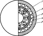 1 тАФ силовой элемент; 2 тАФ пластмассовая трубка; 3 тАФ волокно; 4 тАФ пластмассовая лента; 5тАФполиэтиленовая оболочка