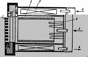 I - экстрактор, 2 - анод, 3 - электромагнит, 4 - система катодов (мультикатоды), 5 - напуск рабочего газа, 6 - водяное охлаждение.