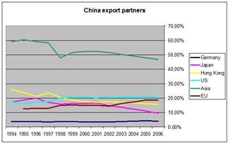 Что касается Японии, то доля экспорта в Азию за последние годы выросла при значительном снижении экспорта в США: с 29% в 1994 году до 21% в 2006. Также, Китай догнал ЕС по доли экспорта, что опять же свидетельствует о росте внутреннего спроса в Китае.