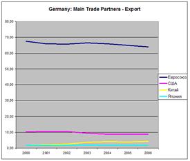 По Германии картина во многом сходна с Евросоюзом в целом. Для экспорта из Германии в Японию и Китай находится приблизительно на одном уровне, хотя стоит отметить, что позиции Китая все же выше (график 7). Что касается экспорта в Соединенные Штаты Америки, тенденция аналогична ЕС: с 2003 года наблюдается падение доли Штатов ниже 10% до 8,73% в 2006 году.