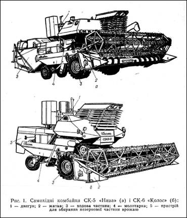 Загальна будова. Комбайни СК-5 (рис. 1.7.1) i СК-6 складаються з таких головних агрегатiв: жатки 2, молотарки 4, двигуна 1, пристрою 5 для збирання незерновоi частини врожаю, ходовоi частини 3. Комбайни також обладнано гiдравлiчною системою i системою сигналiзацii.