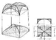 На рис. 1.1 показано образование крестового свода, также на этом рисунке показано два полуцилиндра I и II равных диаметров, которые имеют общую точку, касательную прямую и пересекаются по двум плоским кривым полуэллипсам. В крестовом своде вертикальная нагрузка передается на четыре опоры, а распор отсутствует. Если линия пересечения представляет собой кривую четвертого порядка, то это говорит о том, что диаметр одного из полуцилиндров меньше другого.