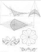 На рис.12 дана схема покрытия, представляющая собой минимальную поверхность с контуром, состоящим из четырёх дуг окружностей. Поверхности этого вида имеют наименьшую площадь при заданном контуре и одинаковую напряжённость в любой точке. Форма поверхности зависит только от формы кривой контура, отдельные её участки имеют положительную и отрицательную переменную кривизну.