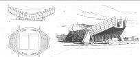 На рис. 14 показан фасад, план и общий вид спортивного зала в Кагаве (Япония), напоминающего корпус корабля. Вантовое покрытие зала представляет собой отсек поверхности, близкой к гиперболическому параболоиду, заданному двумя семействами кривых. Боковые участки тАУ линейчатая поверхность цилиндроида являются пространственные кривые борта и днище корпуса корабля, имеющие различную кривизну, а образующая тАУ прямая, параллельная направляющей плоскости. Сооружение стоит на четырёх опорных пилонах.