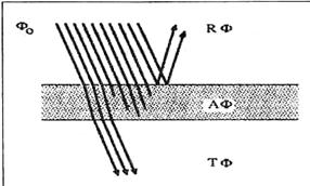 Рисунок 1.1 - Оптичнi властивостi прошарку матерii. Падаючий променевий потiк роздiляiться на три частини: вiдбита частина Rф, поглинена частина Аф i пропущена частина Тф: Рф+Аф+Тф=1