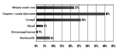 Большинство посетителей салонов красоты г Новосибирск тАФ люди работающие. Чаще всего это специалисты с высшим образованием, каждый пятый посетитель тАФ менеджер высшего звена, а каждый четвертый тАФ служащий [диаграммы 7тАФ8].