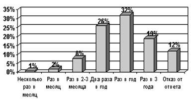 Каждый третий посетитель салона красоты г Новосибирскe путешествует за границу один раз в год, а каждый четвертый тАФ два раза в год [диаграмма. 2.11].