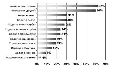 Посещение ресторанов тАФ это самый популярный способ проведения досуга для представителей данной группы. С такой же частотой они ходят только в гости к друзьям. Каждый третий посещает кино и театры [диаграмма 13].