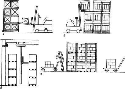 Рис. 3. Выполнение различных операций в зоне хранения: а, б, в тАУ механизированным способом; г тАУ с помощью средств малой механизации