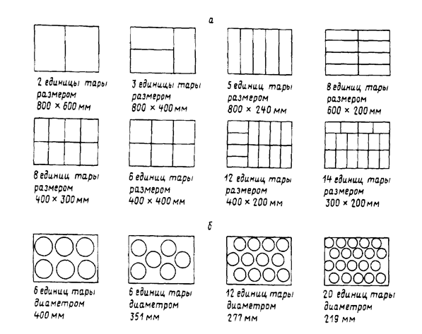 На основании базового модуля разработана единая система унифицированных размеров транспортной тары. Принцип создания этой системы заключается в том, что площадь поддона разделяют на сетку кратных поддону размеров, которые определяют наружные и внутренние размеры транспортной тары. Отдельные варианты схем размещения транспортной тары на поддонах приведены на рис. 5.