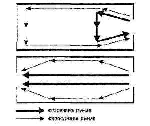 Как правило, часто отпускаемые товары составляют лишь небольшую часть ассортимента, и располагать их необходимо в удобных, максимально приближенных к зонам отпуска местах, вдоль так называемых ВлгорячихВ» линий (рис. 6). Товары, требующиеся реже, отодвигают на Влвторой планВ» и размещают вдоль ВлхолодныхВ» линий.