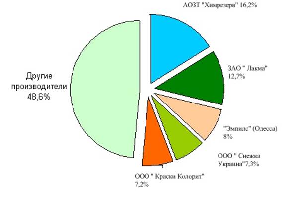 Сегодня эти компании выпускают порядка 40% всей отечественной продукции (в физическом выражении), а в будущем они будут обеспечивать до 50% потребностей украинского рынка. Несмотря на многочисленный состав, лидерами украинского рынка производства красок можно назвать не многих.
