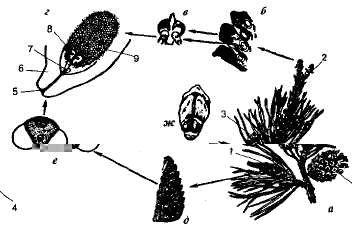 Рис. 9.3. Цикл развития сосны обыкновенной: а тАФ ветка с шишками; бтАФ женская шишка в разрезе; в тАФ семенная чешуя с семязачатками; г тАФ семязачаток в разрезе; д тАФмужская шишка в разрезе; е тАФ пыльца; ж тАФ семенная чешуя с семенами; 1 тАФ мужская шишка; 2 тАФ молодая женская шишка; 3 тАФ шишка с семенами; 4 тАФ шишка после высыпания семян; 5 тАФ пыльцевход; 6 тАФ покров; 7 тАФ пыльцевая трубка со спермиями; 8 тАФ архегоний с яйцеклеткой; 9 тАФ эндосперм.