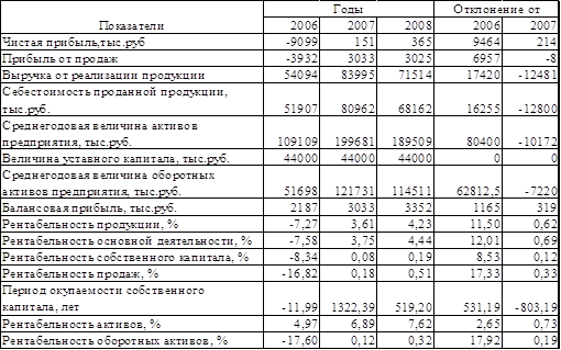 На основании таблицы 1.5. можно сделать вывод, что рентабельность финансово-хозяйственной деятельности ООО ВлАгрофирмаВ» очень низок. Об этом свидетельствуют все показатели рентабельности, приведенные в данной таблице. Это связано с небольшой чистой прибылью при большой среднегодовой величине активов предприятия, с большой себестоимостью производимой продукции при относительно небольшой выручке (разница между ними слишком мала) и так далее. Но вместе с тем мы наблюдаем постепенное повышение всех видов рентабельности и снижение периода окупаемости собственного капитала. Так рентабельность продукции в 2008 году по отношению к 2006 и 2007 увеличилась на 11,5% и 0,62% соответственно, рентабельность основной деятельности тАУ на 12,01% и 0,69, рентабельность собственного капитала тАУ на 8,53% и 0,12%, рентабельность продаж тАУ на 17,33% и 0,33%, рентабельность активов тАУ на 2,65% и 0,73%, рентабельность оборотных активов тАУ на 17,92% и 0,19%. Такое постепенное увеличение уровня рентабельности свидетельствует об укреплении предприятием своего финансового положения и положения на рынке, хотя показатели рентабельности все равно очень низки.