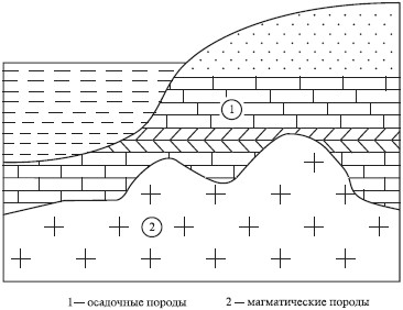 Рис. 17. Схема обнажения горизонтально залегающих горных пород, прорезанных вулканической жилой