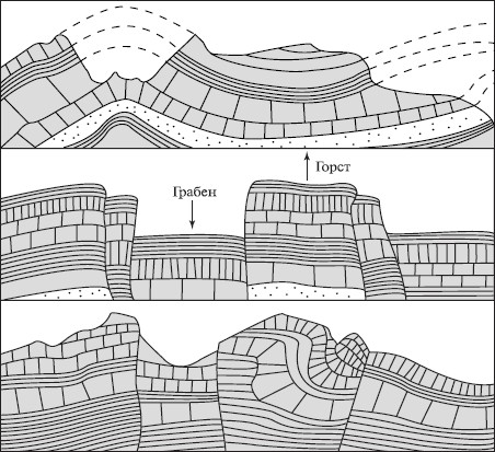 Разрывные движения. Если горные породы недостаточно прочны, чтобы выдержать действие внутренних сил, в земной коре образуются трещины тАУ разломы и происходит вертикальное смещение горных пород. Опустившиеся участки называют грабенами, а поднявшиеся тАУ горстами (рис. 23). Чередование горстов и грабенов создает глыбовые (возрожденные) горы. Примерами таких гор служат: Алтай, Саянские, Верхоянский хребет, Аппалачи в Северной Америке и многие другие. Возрожденные горы отличаются от складчатых как по внутреннему строению, так и по внешнему виду тАУ морфологии. Склоны этих гор часто отвесные, долины, как и водоразделы, широкие, плоские. Пласты горных пород всегда смещены относительно друг друга.